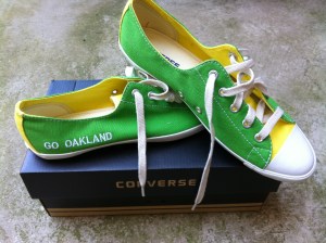 As I wander the steps of the Coliseum during an A’s game, I am always looking for the diehard fans. A good way to spot them is by looking down to their shoes! When I was a partial season ticket holder several years ago, the man with seats next to me wore white, chunky-clunky sneakers with a simple A’s logo on the outside. I was impressed with his true love for the team, but knew there must have been more fashionable options out there.