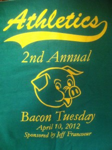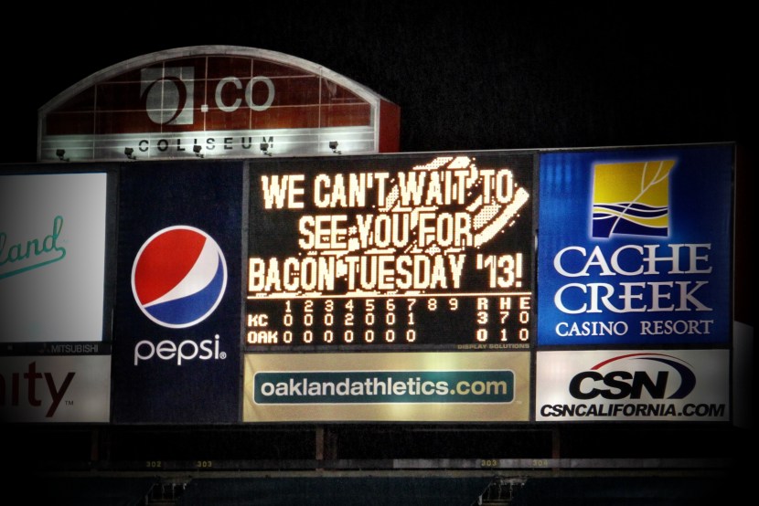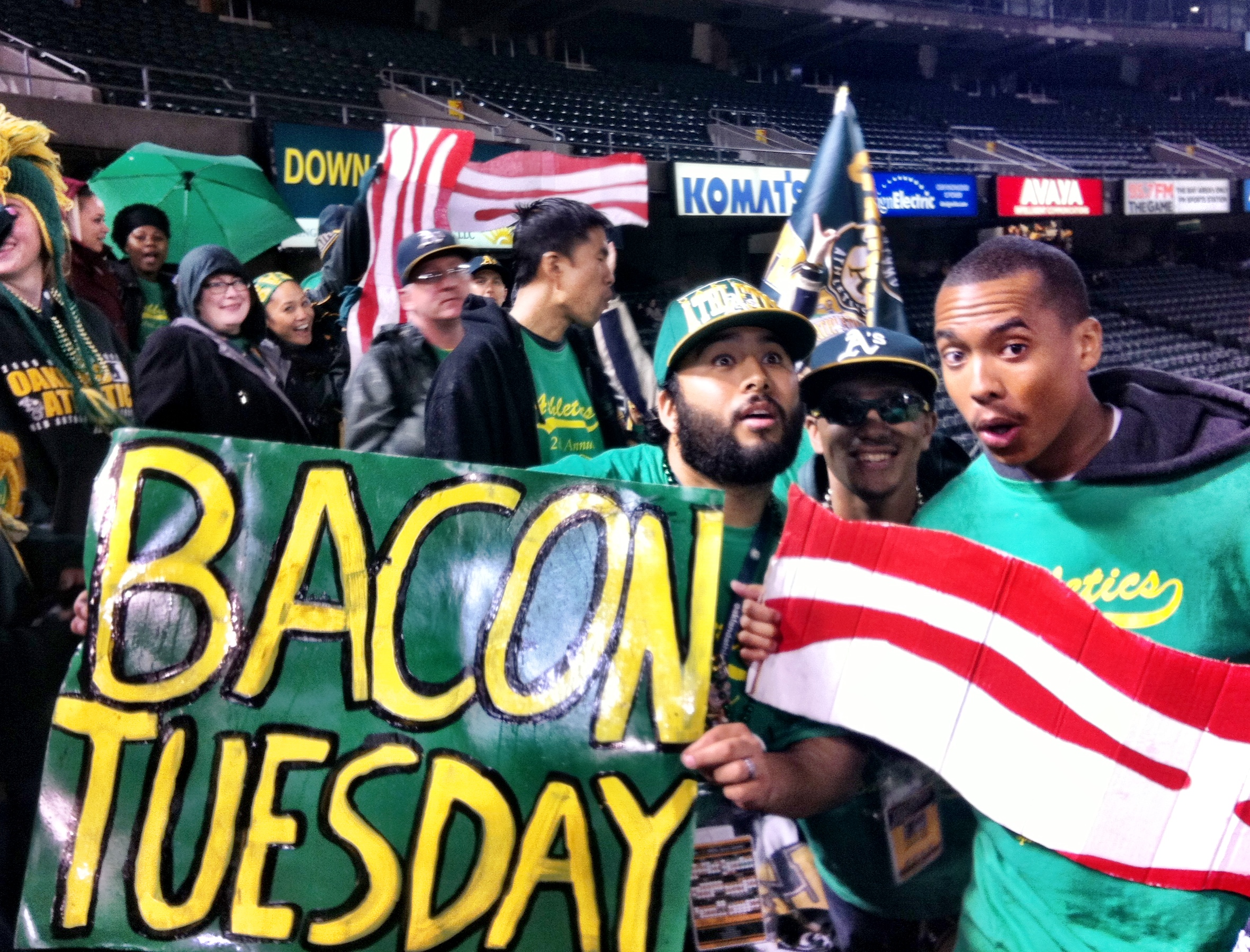 By now, most of you have probably heard a little something about “Bacon Tuesday” last week at the Oakland Coliseum. It was magical. And it represented one of the best parts of baseball: the chance for fun interactions between fans and players. In this case, the crew in the Right Field Bleachers were celebrating a player from *another* team: Jeff Francoeur from the Kansas City Royals. Click this link to check out my live, in-game interview with the organizers behind Bacon Tuesday.