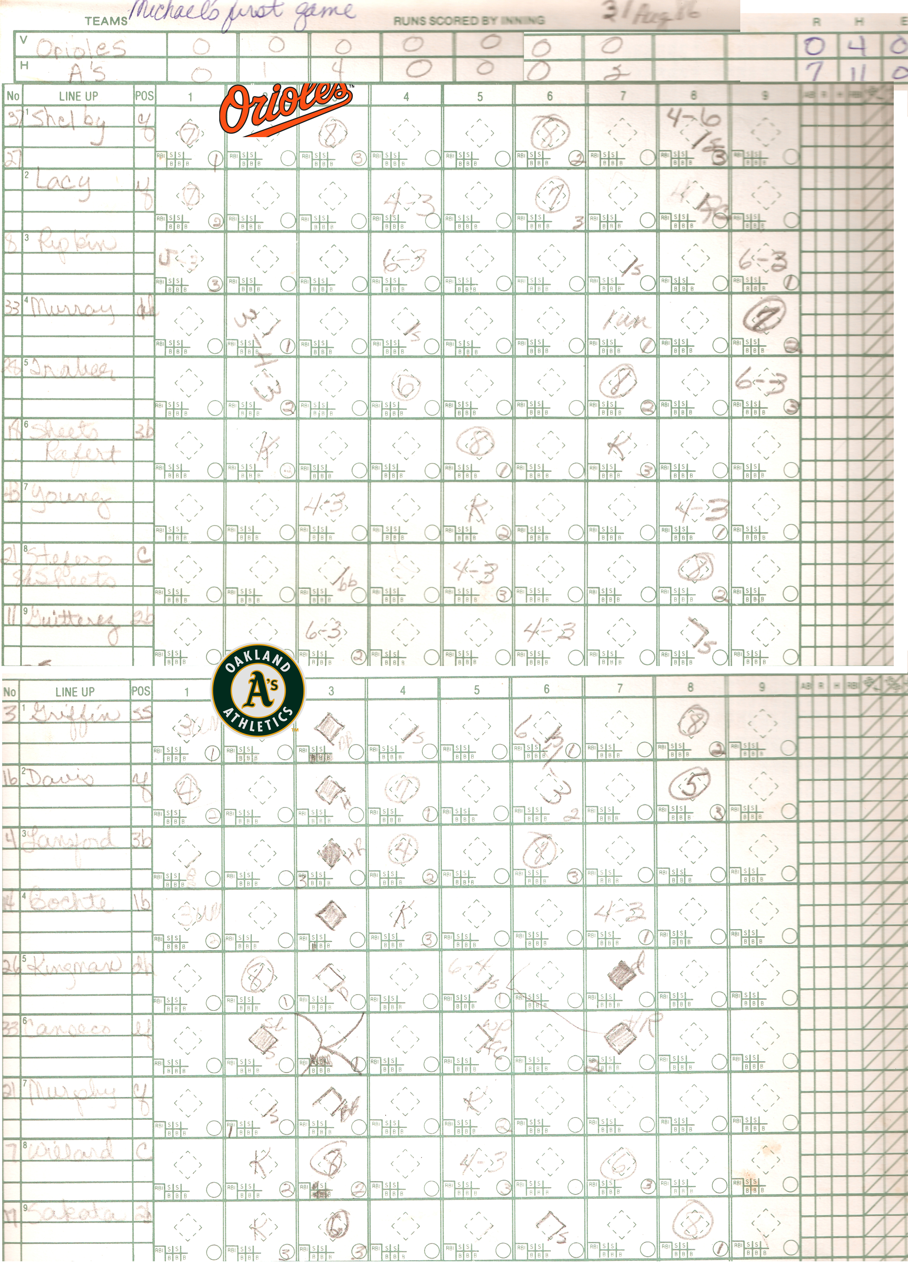 Michael’s parents, Richard and Kathy, have been longtime A’s season ticket holders who fastidiously kept score at every single game. If you look closely at this card from August 31, 1986, you’ll see that both Jose Canseco (his rookie year) and Carnie Lansford hit homeruns for the A’s and that Cal Ripken Jr. was in the starting lineup for the Orioles.