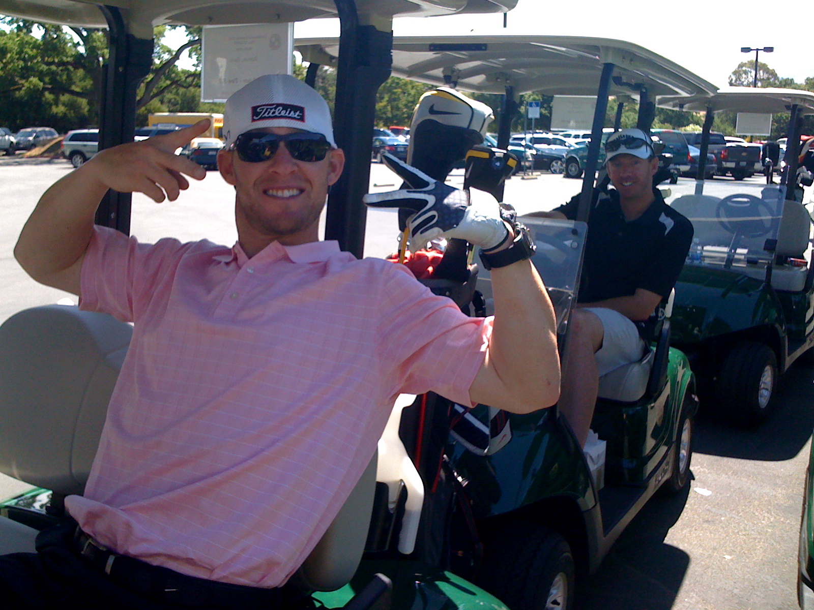 What do A’s players do on their days off? Well today, I can tell you that more than a dozen players and coaches volunteered their time at the team’s annual Community Fund Golf Tournament. As I type, Ryan Sweeney, Mike Gallego and Vida Blue (just to name a few from the current and former A’s roster) are swinging their clubs, drinking some adult beverages and taking in the sun at the Castlewood Golf Course in Pleasanton. Below, Gabe Gross, First Base Coach Todd Steverson, Cliff Pennington, Daric Barton and Brad Ziegler get ready to hit the links.