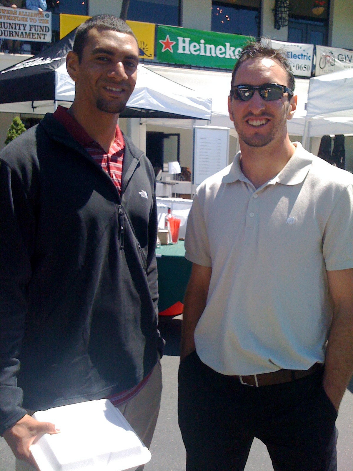 I popped over earlier this morning to host the longest drive competition between Dallas Braden, Michael Wuertz and Gabe Gross. Dallas came in 2nd last year (against Vida Blue and Bullpen Coach, Ron Romanick), so I knew the lefty had a strong swing. After two rounds and *much* heckling, Wuertz emerged the champion. Dallas took second again (in his words, “always the bridesmaid, never the bride”) and Gross came in third. With these characters, it’s always a fun way to begin a day of action! Below, me taking a photo with the winner, Michael Wuertz, Jerry Blevins warming up his cart and Tyson Ross and Adam Rosales ready to drive the beer cart (no really, that was their assigned duty!).