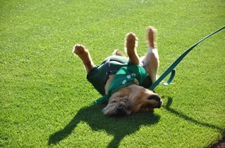 After the pre-game contest, dogs and their owners got the chance to parade around the Coliseum field. This photo to the left is one of my favorite of the night as it represents such unbridled doggie instinct to roll around on that pristine field! Such a happy time!