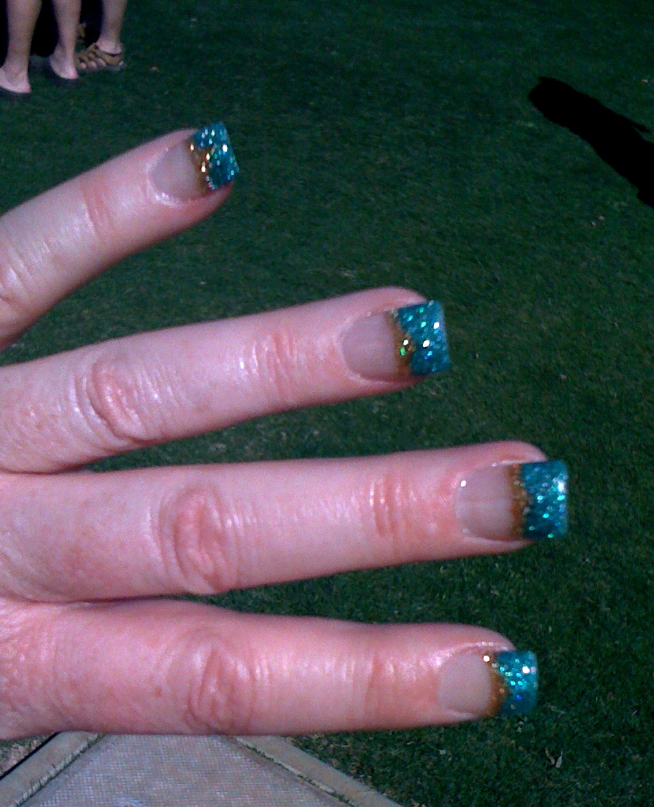 Part of the fun of today’s game was seeing some familiar fan faces. After all, when you spend nearly 300 hours with some of these people during the regular season, they become good friends, fast. Six months between ballgames also starts to feel like a long time after the seasonal routine of day in, day out… These fingernails (photo to the right) belong to Heidi, one of the A’s most dedicated season ticket holders. When I ran into her behind the A’s bullpen, she told me the start time to her roadtrip down to AZ was delayed by a few hours yesterday just to get her nails painted. Well worth it, I’d say! A green and gold French manicure? Now that’s dedication!