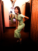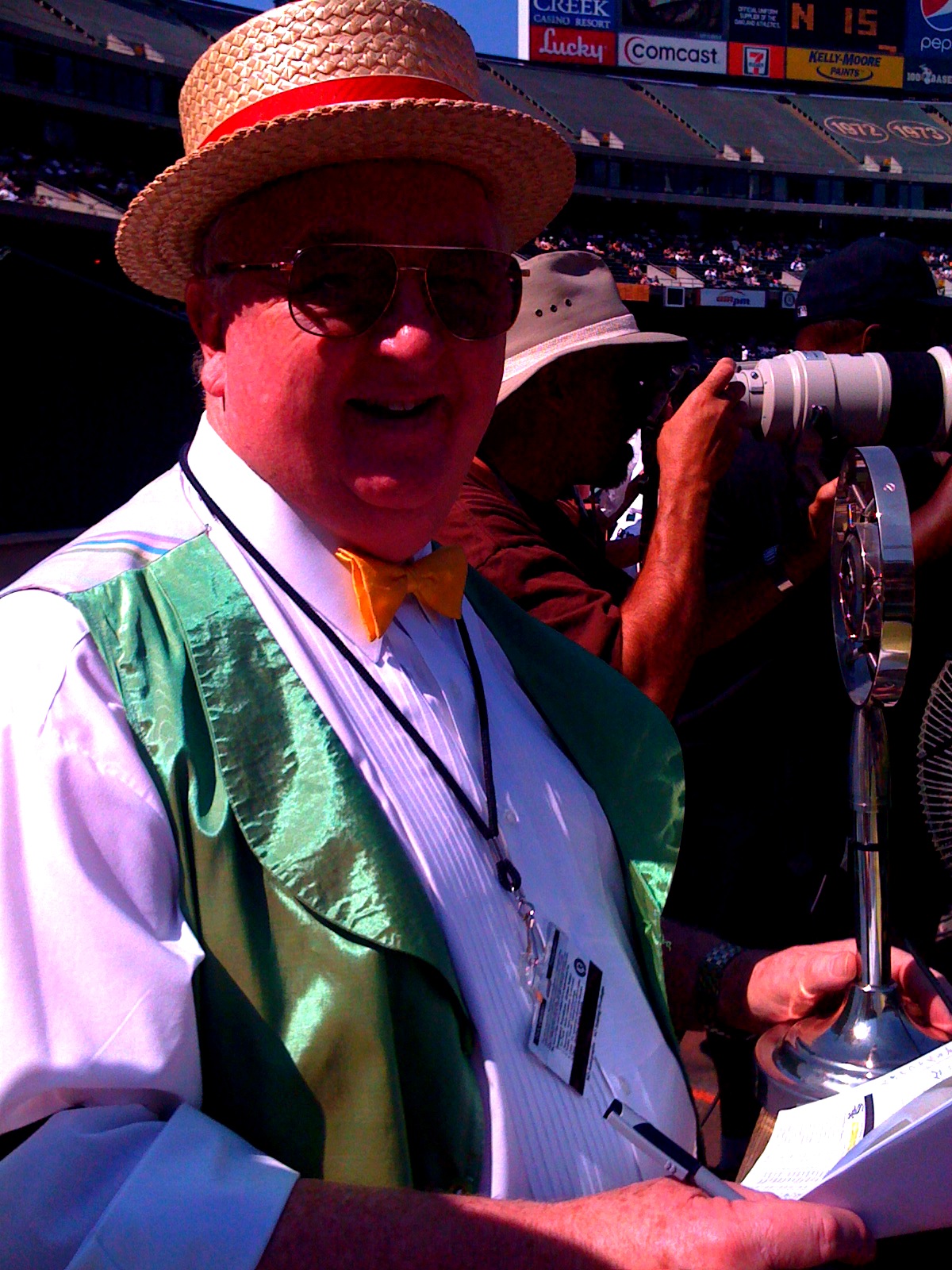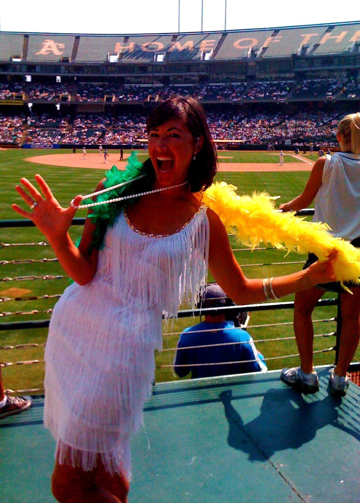 Above, posing with Stomper who wore one of the grooviest costumes in the Stadium. Inspired by “Saturday Night Fever,” this elephant had the bell bottoms and sideburns look down. And speaking of costumes, there was much ado about choosing the right looks for me to wear. In the end, I choose two outfits I already owned. My mom sewed the green dress back in the 70s, so it’s a true vintage piece. The two-piece yellow number also dates back to an earlier, uglier time… And for the record, I was wearing a wig that night — that is not my real hair! Right, snapping a pre-game photo with the one and only Glen Kuiper, the A’s television announcer. Love the wig, the jacket and the ability to not take yourself too seriously!!